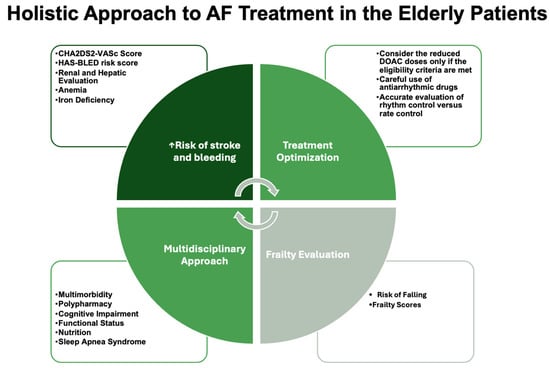 Stroke prevention through anticoagulation is a critical component of AF management in the elderly population. Direct oral anticoagulants (DOACs) have largely supplanted vitamin K antagonists (VKAs) due to their predictable pharmacokinetics, reduced bleeding risk, and lack of routine monitoring requirements []. Among DOACs, apixaban has demonstrated superior safety in frail elderly patients, with a lower incidence of major bleeding compared with rivaroxaban or dabigatran [,,]. Regular monitoring of renal function and adherence is essential to ensure therapeutic efficacy and minimize complications [].