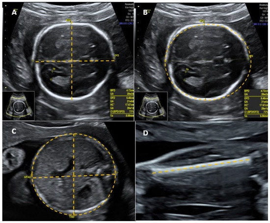 Measurements of biparietal diameter (BPD) (A), head circumference (HC) (B), abdominal circumference (AC) (C), and femur length (FL) (D) according to the International Society of Ultrasound in Obstetrics and Gynecology (ISUOG) guidelines.