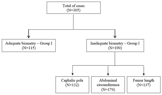 A total of 305 ultrasound examinations were selected and divided into two groups according to the standard of documentation of fetal biometric measurements. Ultrasound examinations with adequate fetal biometry according to ISUOG guidelines were assigned to Group I (N = 115) and ultrasound examinations with inadequate fetal biometry according to ISUOG guidelines were assigned to Group II (N = 190). Among the cases with inadequate fetal biometry, the assessment of the cephalic pole, AC, and FL was considered inadequate in 132, 174, and 137 cases, respectively (Figure 2).