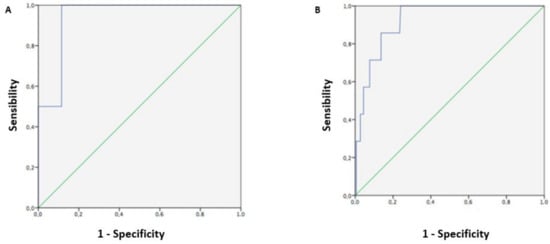 Receiver operating characteristics (ROC) curve for determining the best cut-off value of estimated fetal weight, performed 7 days before delivery, to predict birth weight > 4000 g, among ultrasound examinations with adequate (A) and inadequate (B) fetal biometry.