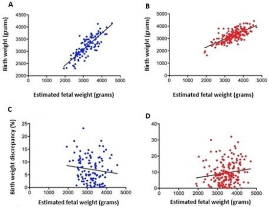 A negative, non-significant correlation was observed between EFW performed up to 7 days prior to delivery and birth weight discrepancy (r = −0.12, p = 0.193) in ultrasound examinations with adequate fetal biometry (Figure 4C). A significant, very weak positive correlation was observed between EFW performed up to 7 days before delivery and birth weight discrepancy (r = 0.16, p = 0.024) in ultrasound examinations with inadequate fetal biometry. It was noted that 2.0% of the birth weight discrepancy was linearly related to EFW. A 1 g increase in EFW was responsible for increasing the birth weight discrepancy by 0.002% (Figure 4D).