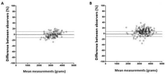 - Sánchez-Fernández, M.; Corral, M.E.; Aceituno, L.; Mazheika, M.; Mendoza, N.; Mozas-Moreno, J. Observer Influence with Other Variables on the Accuracy of Ultrasound Estimation of Fetal Weight at Term. Medicina 2021, 57, 216. [Google Scholar] [CrossRef]