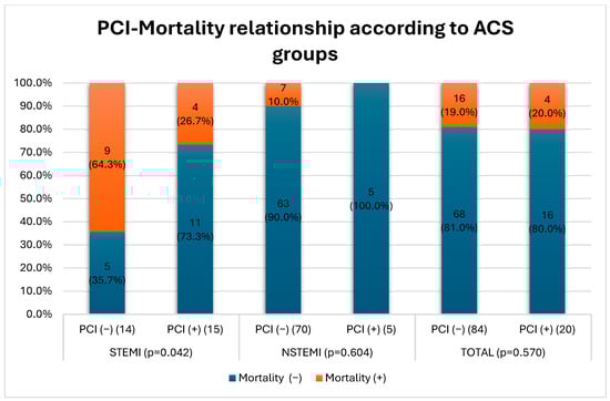 Figure 1 shows the relationship between PCI application and mortality rates in STEMI and NSTEMI groups. In the STEMI group, the mortality rate was 64.3% in patients who did not undergo PCI, whereas the mortality rate was 26.7% in patients who underwent PCI. This difference was statistically significant (p = 0.042). In the NSTEMI group, while the mortality rate was 10.0% in patients who did not undergo PCI, no mortality was observed in patients who underwent PCI (0%). However, this difference was not statistically significant (p = 0.604). In the total evaluation, the mortality rate was 19.0% in patients who did not undergo PCI and 20.0% in patients who underwent PCI, and again, no significant difference was observed (p = 0.570)