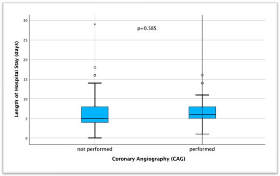 Comparison of the length of hospital stay (days) between patients undergoing and not undergoing coronary angiography (CAG).
