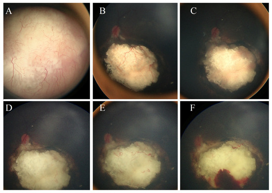Clinical course of a 2-year-old girl with left unilateral retinoblastoma (Group D). (A) Initial presentation showing the tumor before treatment. (B) Complete tumor regression following six cycles of CVE chemotherapy and focal consolidation therapy using Transpupillary Thermotherapy (TTT). (C) Significant tumor recurrence observed three months after the last chemotherapy cycle. (D) Complete tumor regression two months after I-125 radioactive plaque therapy. (E) Sustained tumor regression for an additional two months. (F) Tumor-associated hemorrhage detected six months post-plaque therapy, which resolved gradually without intervention over six months. At two years post-plaque therapy, no tumor activity was detected.