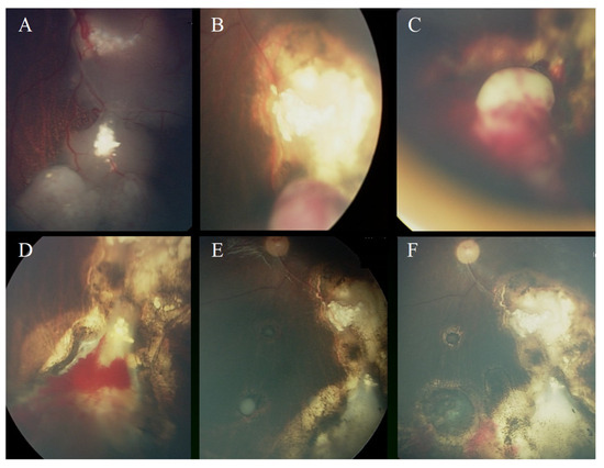 - Shields, C.L.; Say, E.A.; Pefkianaki, M.; Regillo, C.D.; Caywood, E.H.; Jabbour, P.M.; Shields, J.A. Rhegmatogenous Retinal Detachment after Intraarterial Chemotherapy for Retinoblastoma: The 2016 Founders Award Lecture. Retina 2017, 37, 1441–1450. [Google Scholar] [CrossRef]