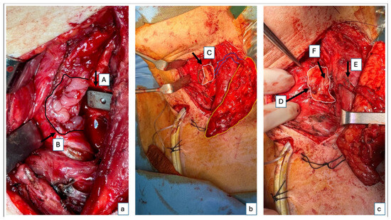 Several reconstructive techniques have been described, ranging from primary closure and pedicled flaps to free tissue transfer. Local options such as the pectoralis major myocutaneous flap or supraclavicular artery island flap provide robust coverage but may be inadequate for posterior defects or cases involving hardware exposure, especially in already irradiated or operated cases [10,11]. Free flaps, particularly the radial forearm free flap (RFFF) and anterolateral thigh (ALT) flap, have been increasingly favored for their thin, pliable tissue and reliable vascularization, making them suitable for complex reconstructions [12,13]. In addition to anatomic reconstructive approaches, it is important to mention the possibility of a diversion loop, which provides an alternative pathway for food continuity. One example is the free jejunal flap, particularly in patients with impaired swallowing and aspiration [14]. However, in our case, we focused on the anatomic reconstruction of the posterior hypopharyngeal/upper esophageal wall and, therefore, chose not to further elaborate on this option.