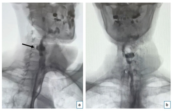 Gastrografin swallow test. Postoperative Gastrografin swallow test performed on the 9th postoperative day shows an intact esophagus with no evidence of leakage or wound dehiscence: (a) oblique right view (the black arrow indicates the position of the cage) and (b) anteroposterior view.