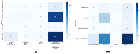 (a) Heatmap of categories by defect etiology. The y-axis displays the different reconstructive categories (local, pedicled, free flap, and acellular dermal matrix), while the x-axis represents the defect etiology. The color coding indicates the frequency: the darker the color, the more frequently the corresponding combination of category and defect etiology occurs. (b) Heatmap of study designs by categories. The y-axis displays the study designs, while the x-axis represents the different reconstructive categories (local, pedicled, free flap, and acellular dermal matrix). The color coding indicates the frequency: the darker the color, the more frequently the corresponding combination of study design and category occurs.