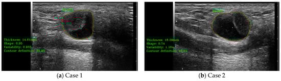 In this case, the medical indicators for B-mode US evaluation that were also valid for elastography were kept. Besides those, some specific indicators and algorithms were developed. The specific elastography indicators evaluated some extra parameters like tissue rigidity. The two sub-algorithms for the detection of the B-mode US region and the colored elastography region were also evaluated; the results are presented in Figure 9. In a similar manner to the Doppler analysis module, on the left side of the images are printed, in a green color, the numerical results of several indicators, including the percentage of the analyzed color classes “Red”, “Green”, and “Blue”. For all the cases presented in Figure 9, the combined percentage of “green” and “blue” was above the defined cut-off threshold for metastasis.