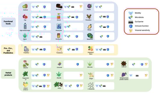 Main mechanisms of action of functional foods, herbal medicine, and other nutraceuticals in IBS. Each icon next to the medicinal products indicates which of the five main pathophysiological mechanisms of IBS the product targets.