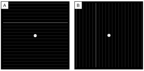 Display of the IDAM. Patients were instructed to stare at the center of the grid (white dot), and lines (highlighted white line) were sequentially displayed one at a time. The examination was conducted along both horizontal (A) and vertical lines (B).
