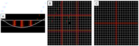 The total distance between the line drawn by the patient and the reference line (red arrows) was defined as the metamorphopsia score. (A) Metamorphopsia scores were calculated for all reference lines, and the sum of these distances was defined as the IDAM score. We also divided the display into nine regions (divided by red lines) and evaluated the presence or absence of metamorphopsia in each area. (B) Metamorphopsia scores were also calculated for both vertical and horizontal lines passing through the center. (red lines) (C).