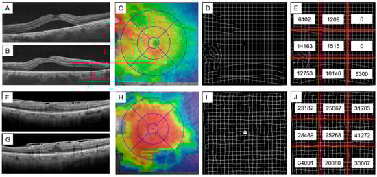 Horizontal B-scan OCT (A,F), vertical B-scan OCT (B,G), OCT MAP (C,H), IDAM (D,I), and IDAM scores in each of the nine sections in patients with epiretinal membrane (ERM) and central serous chorioretinopathy (CSC). Left eye of a 43-year-old male with CSC (A–E): OCT revealed subretinal fluid in the nasal area, extending to the macula. IDAM indicated distorted vision on the temporal side of the center, with an IDAM score of 51,182 pixels. Left eye of a 74-year-old female with ERM (F–J): OCT showed an epiretinal membrane in the macular area. IDAM revealed distorted vision across all nine areas, with an IDAM score of 259,159 pixels.