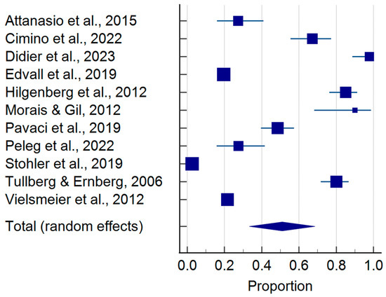 The pooled prevalence of TMDs in tinnitus patients is shown in Figure 2. According to the sample of 114,071 tinnitus patients, 50.99% (95%CI: 33.31–68.54) presented with co-occurring TMDs (Table 3). Moreover, considering the case-control approach, the odds of developing a TMD were more than 2.2 times higher in tinnitus patients as compared to the controls (p-value = 0.002 for random effects)—Figure 3 and Table 4.