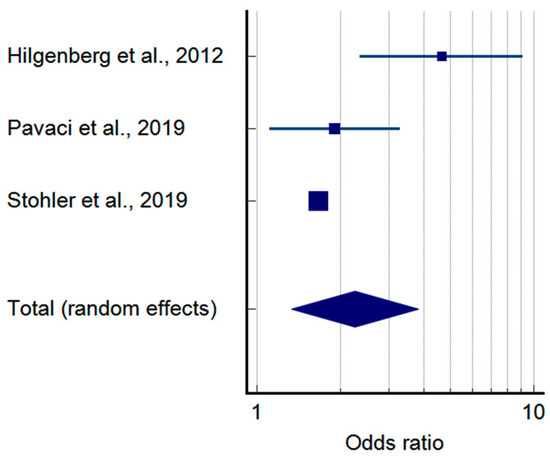 Pooled odds ratio of temporomandibular disorders in tinnitus patients based on case-control studies (squares—odds ratios for individual studies; diamond—polled odds ratio) [29,31,32].