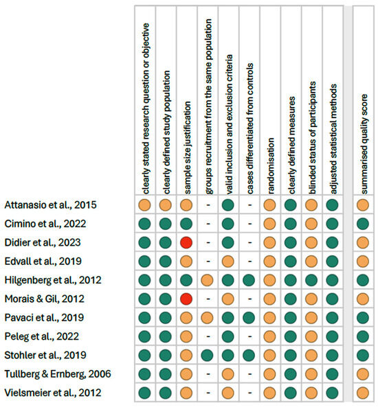 The summarised quality assessment is illustrated in Figure 4. The most common sources of bias were the lack of information on randomisation (in all studies), blinding (in 10 studies), and justification for sample size (in 9 studies). The critical appraisal was conducted by assigning points to each criterion based on potential risk (scoring: 1—low risk; 0.5—unspecified; 0—high risk). According to our analysis, 5 studies (45.5%) were classified as having “good” quality (≥80% of the total score), while 6 studies (54.5%) were categorized as having “intermediate” quality (≥60% of the total score).