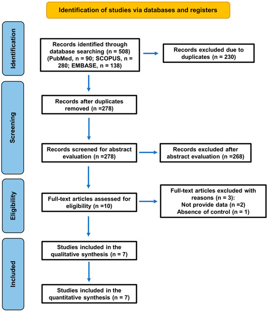 A total of 508 records (PubMed, n = 90; SCOPUS, n = 280; EMBASE, n = 138) were initially identified, but 230 were duplicates. Two hundred and seventy-eight records were screened for abstract evaluation, and two hundred and sixty-eight were excluded for not meeting the inclusion criteria. During the eligibility assessment, 3 reports were excluded for two specific reasons: lack of quantitative data (not reporting the necessary numerical values) [7,22] and absence of healthy controls [23] (Table 1).