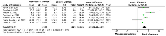 The meta-analysis was performed using data from Table 3, and its forest plot is shown in Figure 2. The forest plot summarized mean differences (MD) and confidence intervals (CI) across included studies, providing a visual representation of the pooled effect size and its statistical significance. The overall MD was calculated using a random-effects model meta-analysis, resulting in a MD = 3.13 (95% CI = 2.12–4.15; p < 0.00001), which means that postmenopausal women had a DMFT index 3 units higher than the control patients.