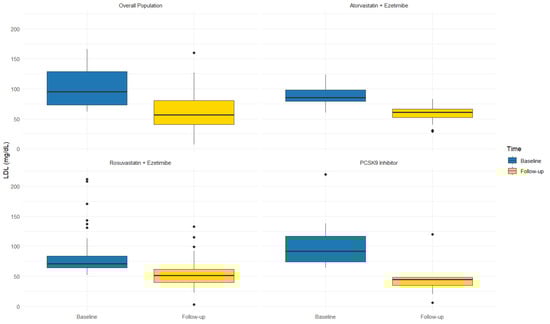 Categorical data were presented as frequency and percentage, while continuous variables were expressed as either median (interquartile range [IQR]) or mean ± SD, depending on their distribution, which was assessed using both the Kolmogorov–Smirnov and the Shapiro–Wilk tests. Differences for categorical variables were assessed by the chi-square test, with the application of Yates correction where appropriate. Either parametric Student’s t-test or nonparametric Mann–Whitney U test and Wilcoxon test were used to compare continuous variables, depending on their distribution. Box plot analysis was performed to visually depict LDL levels within each therapy group at baseline and after BA add-on. A 2-sided p-value < 0.05 was considered statistically significant. All analyses were conducted using SPSS software version 24.0 (SPSS, Chicago, IL, USA), while box plots were generated using RStudio® 2024.09.1 software (RStudio, Boston, MA, USA).