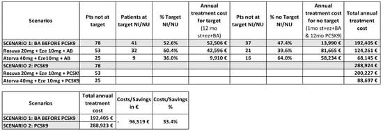 Pharmacoeconomic analysis of BA treatment in patients not achieving their LDL-c therapeutic target with background therapy. Scenario 1 describes the real-world setting; Scenario 2 describes the optimal approach in pre-BA era.