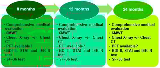 The 6MWT, radiological tests, and PFT results at 8-, 12- and 24-month follow-up.