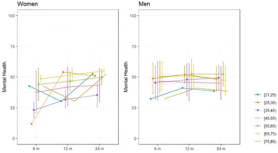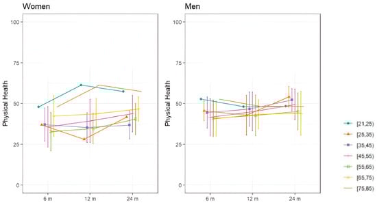 Regarding subjective assessments of quality of life, assessed with the SF36, Figure 3 and Figure 4 show the evolution of mental and physical health perception by sex over the two-year follow-up period. In terms of mental health, women under 35 experienced greater deterioration at 8 months, which progressively improved. Men demonstrated less deterioration in mental health than women. As for physical health perception, women under 25 and those over 75 reported better physical health than other women. Overall, women showed a progressive improvement in both mental and physical health, while men’s health remained relatively stable throughout the follow-up periods.