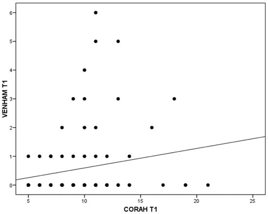 When relating the different tests carried out on the guardians to the tests and data collected from the children, only a weak correlation (r = 0.18; p = 0.0095) was detected between the anxiety of the guardians (Corah) and that of the children (Venham < 8 years) at the first visit (Figure 2).