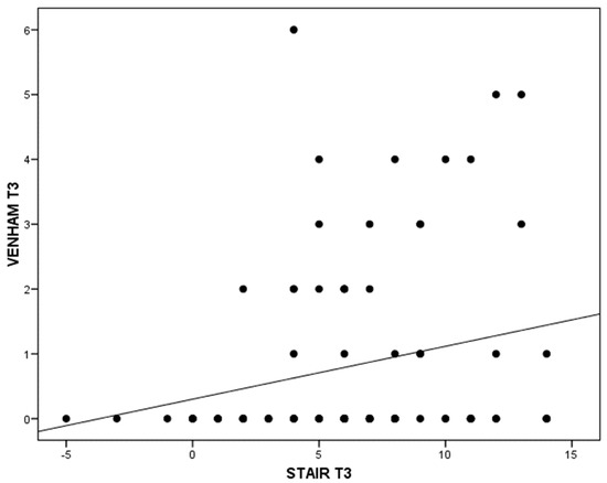 As with the correlation between Venham and STAI-Trait at the third visit, where statistical significance is reached (p = 0.035), it can only be assessed as “weak” (r = 0.22). The higher the parents’ trait anxiety score, the higher the children’s Venham score at the last treatment visit (Figure 3).