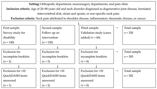 The study was a cross-sectional study. This retrospective study used data from two prospectively collected databases. The study included participants aged 20 to 90 years. Patients with neck pain, with or without arm pain, were recruited from outpatients and inpatients of the orthopedics department, the neurosurgery department, and the pain clinic of Kaohsiung Medical University Hospital in Kaohsiung, Taiwan, from April 2011 to May 2024. Patients identified according to symptoms, physical signs, and imaging study results were recruited by physicians. The causes of the neck pain were variously diagnosed as degenerative joint disease, herniated intervertebral disk, strain/sprain, and non-specific etiology. Participants with neck pain caused by shoulder disease, inflammatory rheumatic disease, or cancer were excluded. The consecutive samples diagram is shown in Figure 1. We excluded data from patients who answered fewer than 10 items on the QuickDASH, as its instructions require a minimum of 10 out of 11 items to be completed. As a result, three participants were removed. If a participant completed only 10 items, we did not impute the missing data using statistical methods. Ultimately, 302 patients with neck pain, with or without arm pain, were included in the Rasch analysis. The study received approval from the hospital’s Institutional Review Board (KMUH-IRB-980589 and KMUH-IRB-E(I)-20210363), and all participants gave written informed consent. The QuickDASH was used to assess the upper limb problems in all participants.