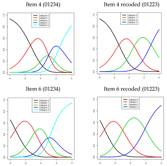 The response category probability curves for items 4 and 6. Left upper panel shows item 4 without recoding (01234) and right upper panel shows item 4 with recoding (01223); the left lower panel shows item 6 without recoding (01234) and the right lower panel shows item 6 with recoding (01223). After recoding, items 4 and 6 show well-functioning category responses. X-axis: item difficulty, Y-axis: category probability.