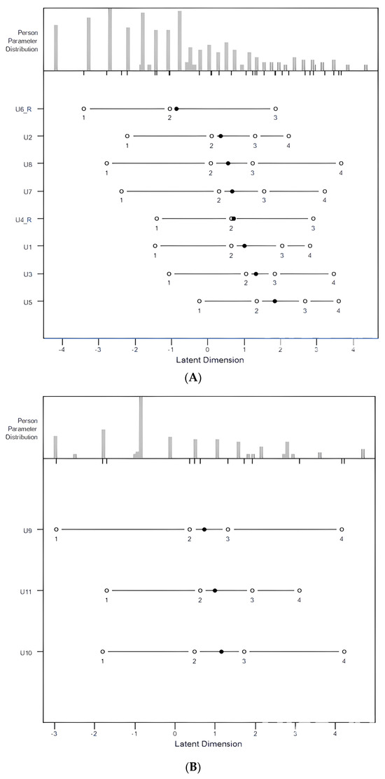 Person–item threshold map of the QuickDASH. (A) Items 1 to 8. (B) Items 9 to 11. The upper panel shows the person parameter distribution, and the lower panel shows the item difficulty. Items are sorted by item difficulty. X-axis: logits.
