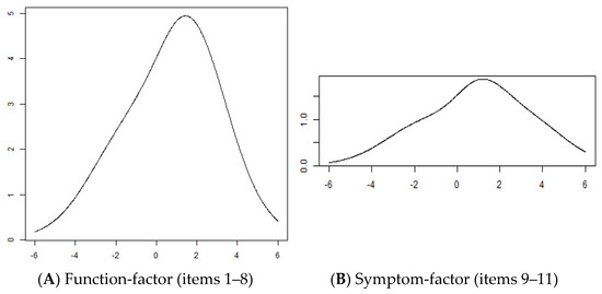 The test information curve is presented in Figure 4A. The test information curve was in the form of a bell, with the maximum located at the middle of the person measure scale. The results showed that the value of the maximum test information was 4.94. The reliability was good, with a person separation index of 0.85 (a value above 0.75 indicates good reliability). The results of the sensitivity analysis were consistent with the findings (without excluding the missing data).
