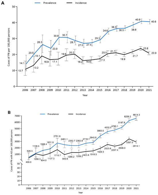 The number of individuals in the JMDC database increased each year, from 297,545 in 2006 to 10,081,414 in 2021 (Supplementary Figure S2). In the cross-sectional analysis, the population for whom the prevalence of PN was determined ranged from 247,727 in 2006 to 7,779,860 in 2021, while the population for whom the incidence of PN was determined ranged from 224,955 in 2006 to 6,627,954 in 2021.