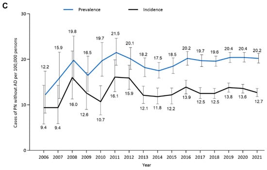 This retrospective database study found that the prevalence of PN in Japan was 14 per 100,000 persons in 2006 and 41 per 100,000 persons in 2021. The prevalence increased somewhat from 2006 to 2016, but there was little variation over the rest of the study period. In 2021, the impact of COVID-19 might be considered when the incidence (new diagnosis of PN) is dropping sharply, as most outpatient visits suddenly decreased due to the pandemic [21,22], and the age/sex-adjusted prevalence of PN was 39 per 100,000 persons.
