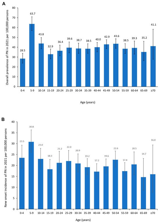 (A) Overall prevalence and (B) new onset incidence of prurigo nodularis in 2021 by age group. Error bars indicate 95% confidence intervals.