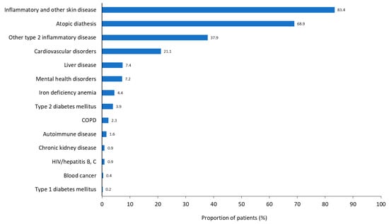Overall prevalence of comorbidities in the prurigo nodularis cohort. Substance abuse was reported in <0.1% of the cohort. COPD, chronic obstructive pulmonary disease; HIV, human immunodeficiency virus.