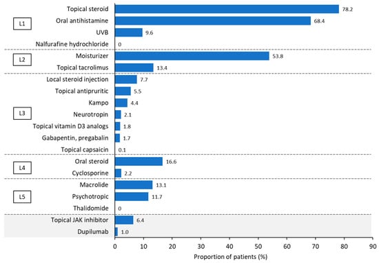 Treatment prescribed during the follow-up period in participants with prurigo nodularis. Treatments are categorized based on the Japanese Dermatological Association 2020 guidelines for prurigo [1]. Line 1 (L1) = topical steroid (TS) therapy ± antihistamines ± ultraviolet B phototherapy (with nalfurafine hydrochloride for individuals on hemodialysis, with chronic liver disease, or with other forms of prurigo); L2 = taper TS potency + moisturizer + tacrolimus ointment; L3 = TS therapy + adjunctive therapy (including combined used of local steroid injection, topical heparinoid [occlusive application], vitamin D3 analogs, tacrolimus ointment, antipruritic ointment, capsicum ointment, liquid nitrogen, neurotropin [extracted fluid from the inflamed skin of rabbits inoculated with vaccinia virus], reserpine, gabapentin/pregabalin, or traditional Chinese medicine); L4 = TS therapy + systemic steroid therapy or cyclosporine; or L5 = antibiotics (macrolides), anti-anxiety agents, or thalidomide. The treatments in the grey box at the bottom of the figure are not included in the guidelines. JAK, Janus kinase; UVB, ultraviolet B.