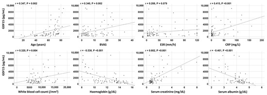 Circulating GDF15 was significantly correlated with BVAS (r = 0.340). Additionally, age (r = 0.347), CRP levels (r = 0.415), white blood cell count (r = 0.320), and serum creatinine level (r = 0.602) exhibited significant and positive correlations with circulating levels of GDF15. Erythrocyte sedimentation rate tended to correlate with circulating GDF15, but it was not significant. Additionally, circulating GDF15 was inversely correlated with haemoglobin (r = −0.530) and serum albumin (r = −0.461) (Figure 1).
