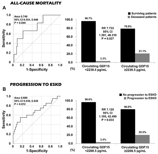 3.6. Determination of a Cut-Off of Circulating GDF15 at Diagnosis and Its Relative Risk for Progression to ESKD During the Disease Course
