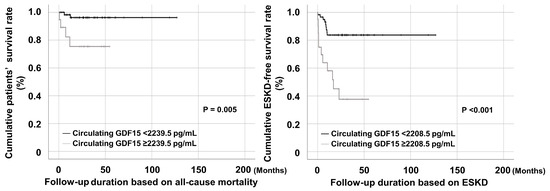 Patients with circulating GDF15 ≥ 2239.5 pg/mL exhibited a significantly lower patient survival rate than those with circulating GDF15 <2239.5 pg/mL (p = 0.005). Additionally, patients with circulating GDF15 ≥ 2208.5 pg/mL showed a significant reduction in the rate of ESKD-free survivals compared with those with circulating GDF15 <2208.5 pg/mL (p < 0.001) (Figure 4).