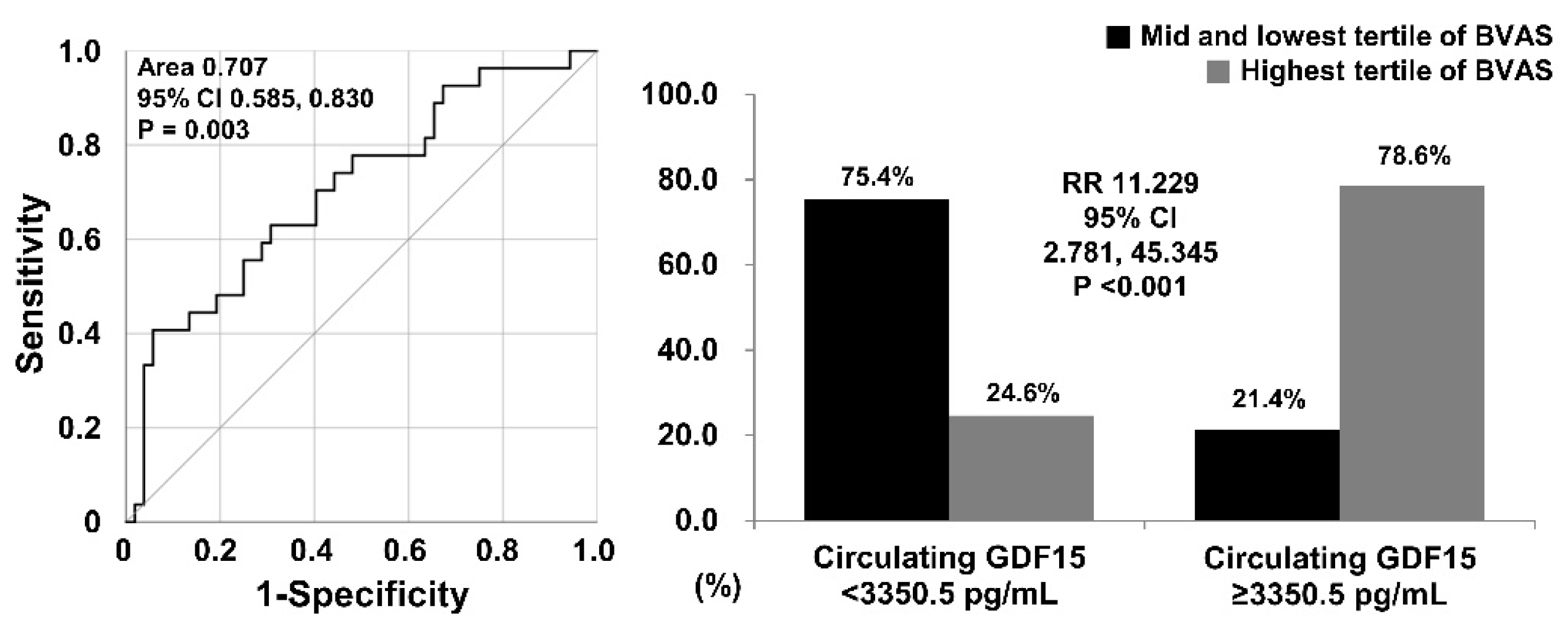 3.4. Optimal Cut-Off of Circulating GDF15 and Its Relative Risk to the Highest Tertile of BVAS at Diagnosis