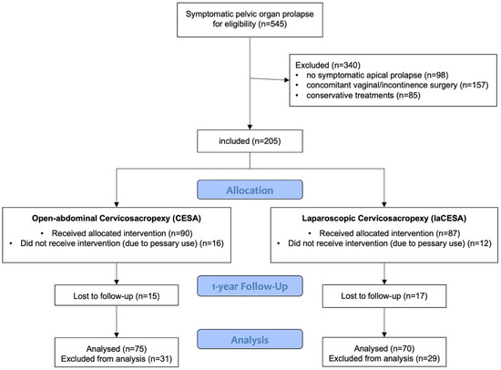 During 2014 to 2019, a total of over 1600 patients presented to our tertiary university center with pelvic floor dysfunction. Of these, 517 patients had prolapse symptoms (with or without urinary incontinence). Of these 517 patients, 419 had symptomatic apical prolapse (POP-Q stage I–IV) of the uterus. In 205 patients, the sole indication was for surgical apical bilateral fixation (with or without supracervical hysterectomy) without concurrent vaginal or incontinence surgery. Thirty-two patients (16%) were lost to follow-up and a total of 28 patients (14%) refused surgery and preferred pessary therapy (Figure 1). This study included non-pregnant women with POP-Q stages I-IV of symptomatic apical prolapse, with or without urinary incontinence (UI), aged 18 years and older or previous surgery. Exclusion criteria were a body mass index (BMI) exceeding 55 kg/m2, the presence of pure stress urinary incontinence (SUI) without apical prolapse, and the absence of complete one-year postoperative follow-up data.