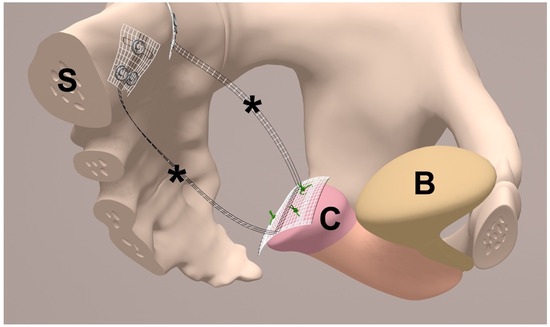 Half-sagittal view of bilateral uterosacral ligament (USL) replacement in the female small pelvis. The middle part of the polyvinylidene fluoride (PVDF) structure (*) is sutured to the cut surface of the cervix (C). The bladder (B) is not separated and remains on the cervix (C). The * indicate both arms of the PVDF structure (Dynamesh CESA, FEG Textiltechnik mbH, Aachen, Germany) for USL replacement. Each arm has a defined length of 8.8 cm and width of 0.4 cm and is placed below the peritoneal fold of the left and right USL. Both ends of the PVDF structure are fixed in front of the sacral vertebra (S) to the prevertebral fascial layer at the level of S1/promontory (made with Adobe Illustrator 2021, Version 25.2.3, Dublin, Republic of Ireland).