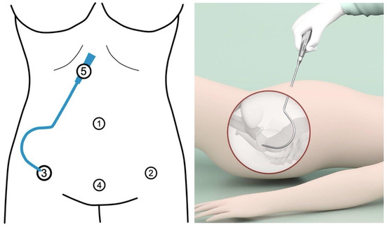Trocar placement and insertion of uterosacral ligament (USL) tunneling device. Port locations with 4 trocar entries in laparoscopic cervicosacropexy: Opitcal, umbilicus (10 mm) (1). Left lower abdomen, in the anterior axillary line at the level of superior spina ischiadica, laterally to the epigastric vessels (5 mm) (2). Right lower abdomen, in the anterior axillary line at the level of superior spina ischiadica, laterally to the epigastric vessels (5 mm) (3). Centrally placed trocar in the lower abdomen, within the middle line 2 cm above the symphysis (4). As a tunneling device (5), a semi-circular curved hook (IVT02, DynaMesh, FEG) with a handle is used. The right lateral trocar incision (3) is used for USL tunneling: after the right lateral trocar has been removed, the tunneling device is inserted through its incision (personal collection) (made with Adobe Illustrator 2021, Version 25.2.3, Dublin, Ireland).