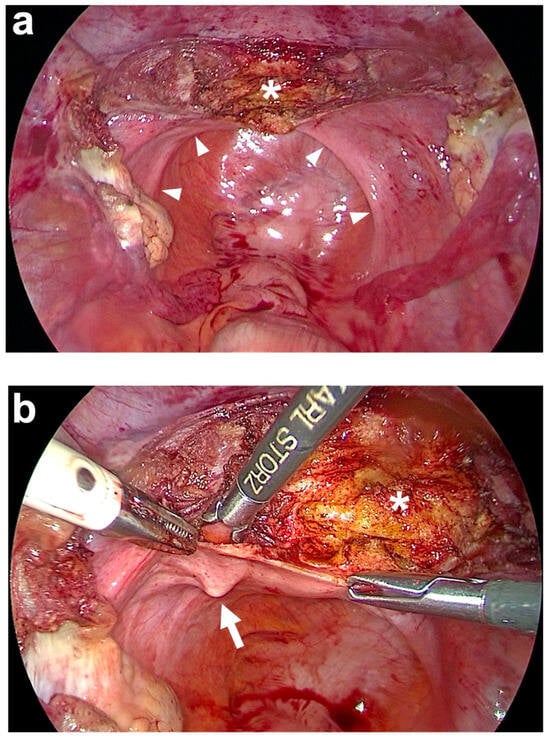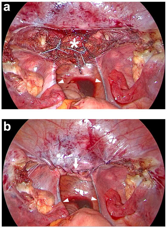 Peritoneal closure above the middle part of the PVDF (polyvinylidene fluoride) structure on the cut surface of the cervix. (a) The PVDF structure (white asterisk) is sutured to the cut surface of the cervix with 3 interrupted, non-resorbable sutures. (b) At the end of the laparoscopy, the peritoneum above the middle part of the PVDF (polyvinylidene fluoride) structure on the cut surface of the cervix is closed with a running, absorbable suture (white arrow). The entire PVDF structure is covered by peritoneum, including both arms which lie in the original course of both uterosacral ligaments (USL) (white arrowheads). Due to the bilateral course in the peritoneal fold of the USL and the posterior attachment left and right laterally to the sacrum, the intestine is not constricted (personal collection).