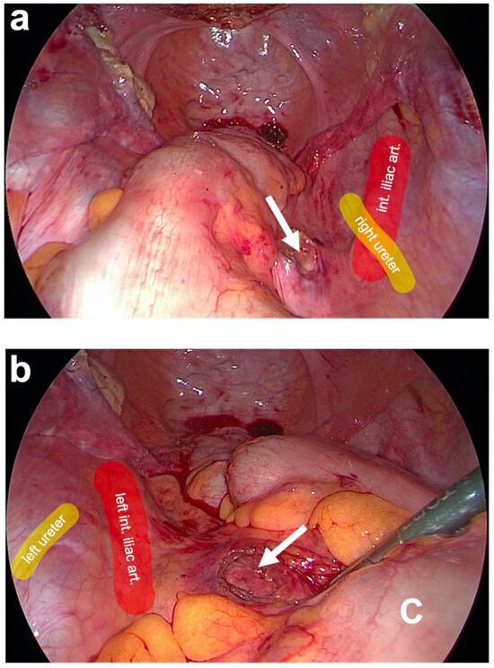 Once the tip of the tunneling device is positioned within the peritoneal folds of the USLs, it glides beneath the peritoneum towards the lateral cervix on both sides of the small pelvis. This technique significantly reduces the risk of major injuries to surrounding vessels, ureters, and nerves and thus the peritoneum is left intact [12,13]. While minor adjustments were necessary to optimize the laCESA technique, these modifications did not introduce significant complications such as bowel perforation, vascular injury, or ureteral lesions.
