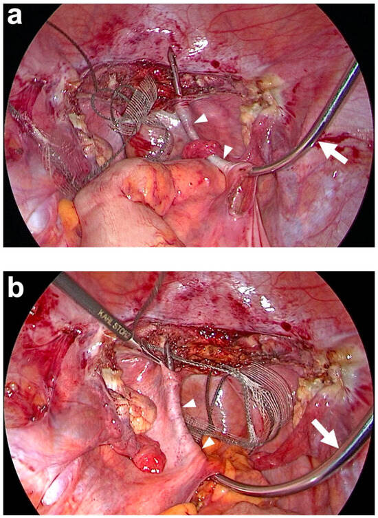 Tunneling of both uterosacral ligaments (USL) (white arrowheads) with the tunneling device (semi-curved hook). (a) The tunneling device (white arrow) is brought into the abdominal cavity via the right lateral trocar incision and then inserted through the peritoneal window previously prepared on the promontory on the right. The blunt tip of the tunneling device is then carefully advanced below the peritoneum paracervically to the right until it is exposed. The end of the right PVDF structure is now attached to the tip of the tunneling device and inserted into the right course of the original USL as it is retracted. (b) The same procedure on the left side after the colon has been pulled to the side. The tunneling device is inserted through the peritoneal window previously prepared on the promontory on the left. The blunt tip of the tunneling device is then carefully advanced below the peritoneum paracervically on the left until it is exposed. The end of the left PVDF structure is attached to the tip of the tunneling device and inserted into the left course of the original USL as it is retracted (personal collection).