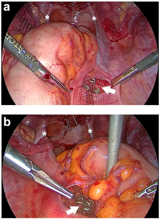 Posterior fixation of both arms of the PVDF (polyvinylidene fluoride) structure for uterosacral ligament (USL) replacement left and right at the sacrum. (a) Fixation of the right arm of the PVDF structure in the designated markings using three titanium helices (white arrow). (b) Fixation of the left arm of the PVDF structure in the designated markings (white arrow). The white asterisks show both PVDF structures, which lie in the original course of both USLs. After fixing the band structures, the ends of these two are cut off cranially of the helices (personal collection).