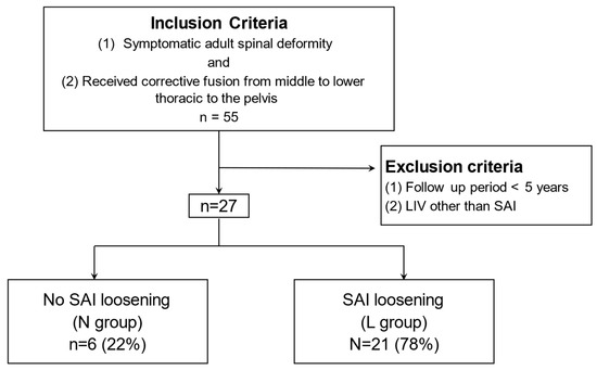 Participants: We retrospectively reviewed 55 patients operated on during the aforementioned study period. Inclusion criteria were as follows: (1) patients with adult spinal deformity; (2) patients who met at least one of the following radiographic criteria (Cobb angle > 20°, sagittal vertical axis (SVA) > 5 cm, pelvic tilt (PT) > 25°, or thoracic kyphosis (TK) > 60°); (3) patients who received corrective fusion from the middle to lower thoracic to the pelvis. Exclusion criteria were as follows: (1) follow up period < five years; (2) patients without SAI screws as the primary anchoring mechanism. Accordingly, we included 27 patients in this study (Figure 1). The 27 patients were divided into 2 groups based on the presence or absence of SAI screw loosening that could influence long-term clinical outcomes and alignment. Screw loosening was defined based on the presence of a radiolucent area of 1 mm around the screw observed on computed tomography scans performed five years after surgery (Figure 2) [5]. Screw loosening was determined by two expert surgeons, and those with different results were determined by discussion. Radiological bony fusion at L5/S was also evaluated using CT reconstruction images. We judged whether bony fusion had been achieved with continuous bony bridging on sagittal and coronal CT scans. There were 6 patients (22%) who showed no signs of screw loosening and constituted the “N” group, while the remaining 21 patients (78%), demonstrating screw loosening, were attributed to the “L” group.